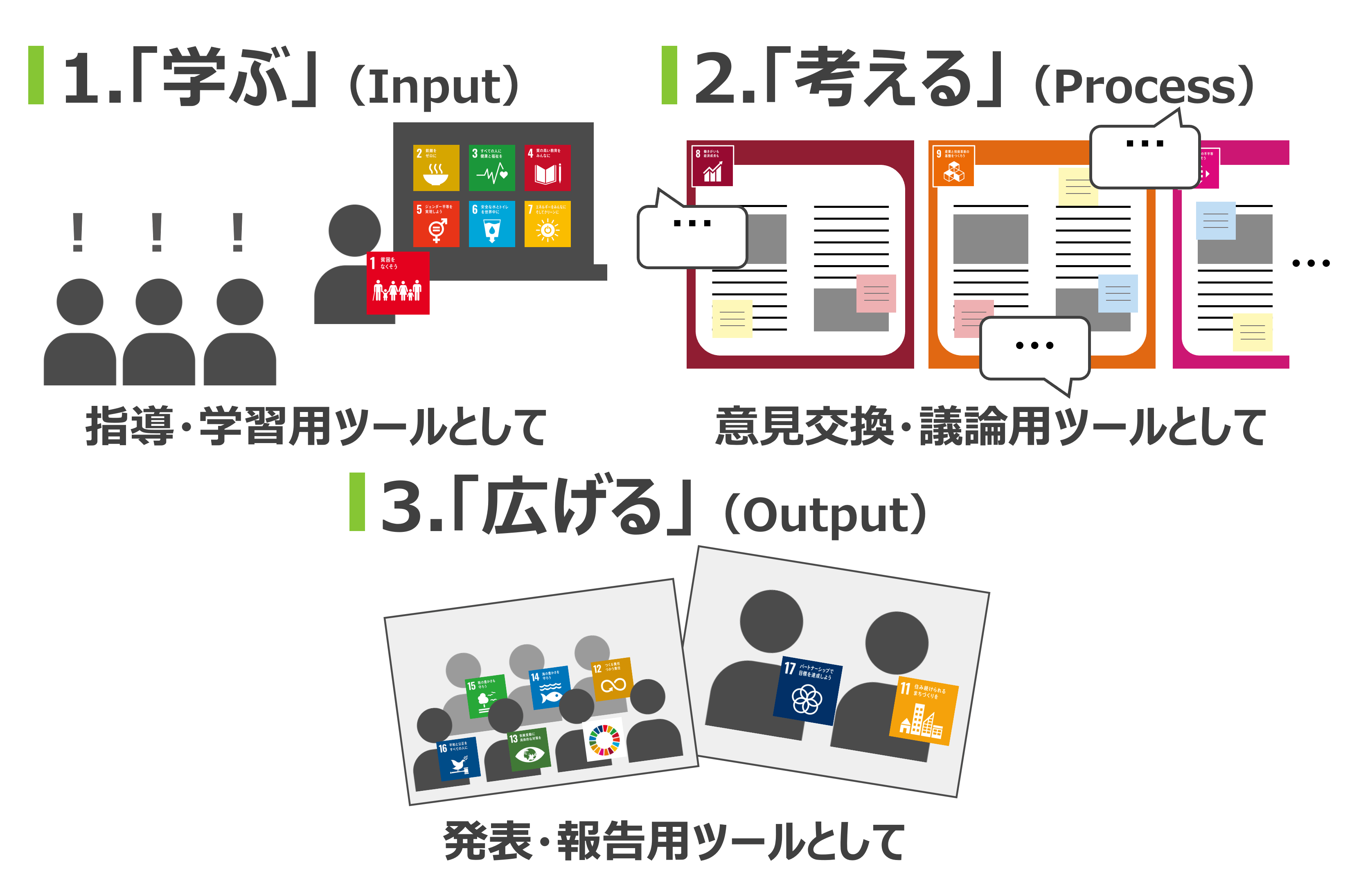 「学ぶ」(SDGsに関する情報を整理して理解する)、「考える」(SDGsに貢献しうる行動を検討する)、「広げる」(考えた結果を広く共有する)など多様な活用シーンに対応した学習コンテンツになっています。
