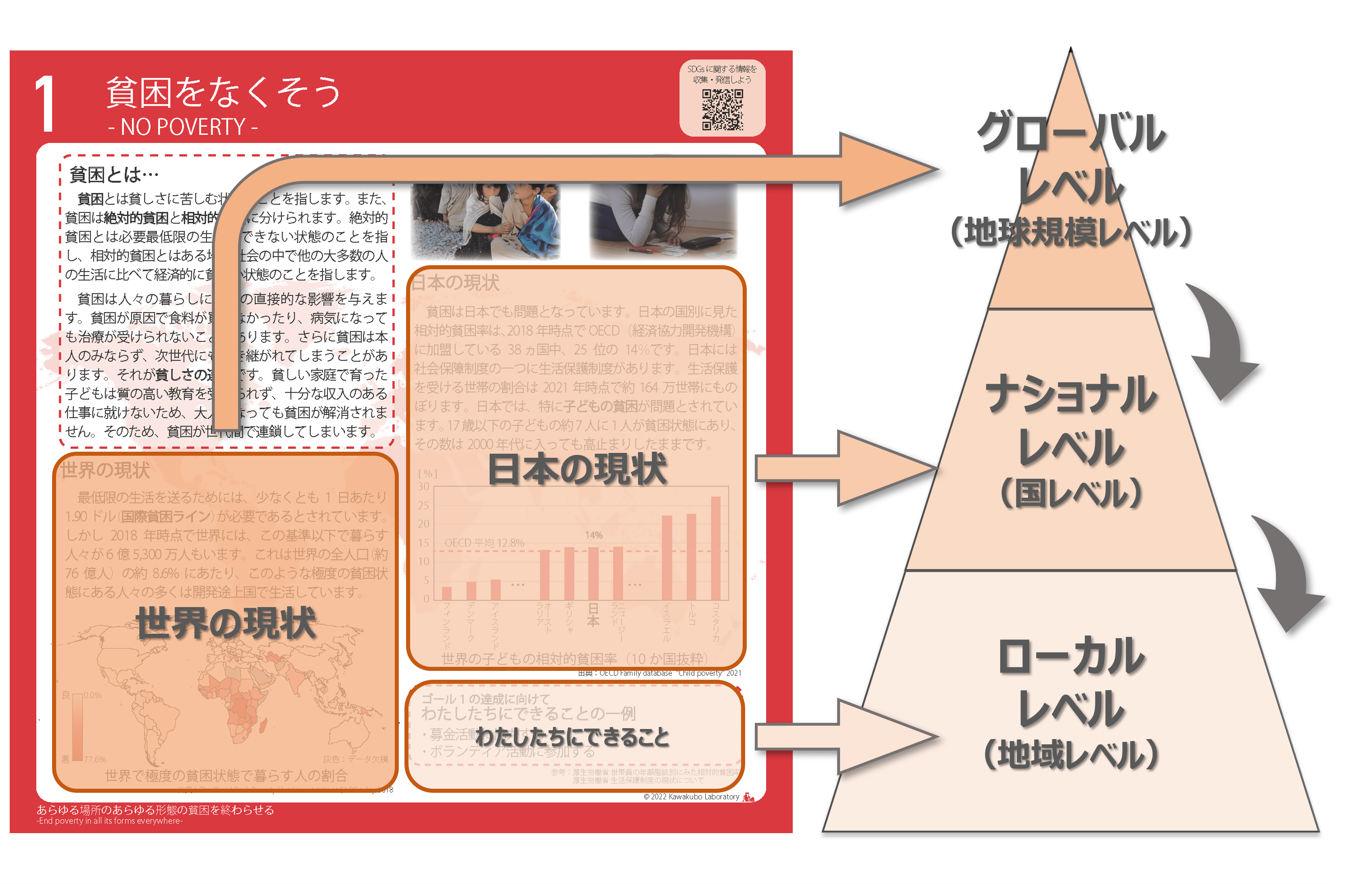 ゴールパネルでは、グローバル(地球規模レベル)からナショナル(国レベル)、ローカル(地域レベル)へスケールダウンを行うことによってSDGsを身近に感じれるような仕組みを採用しています。