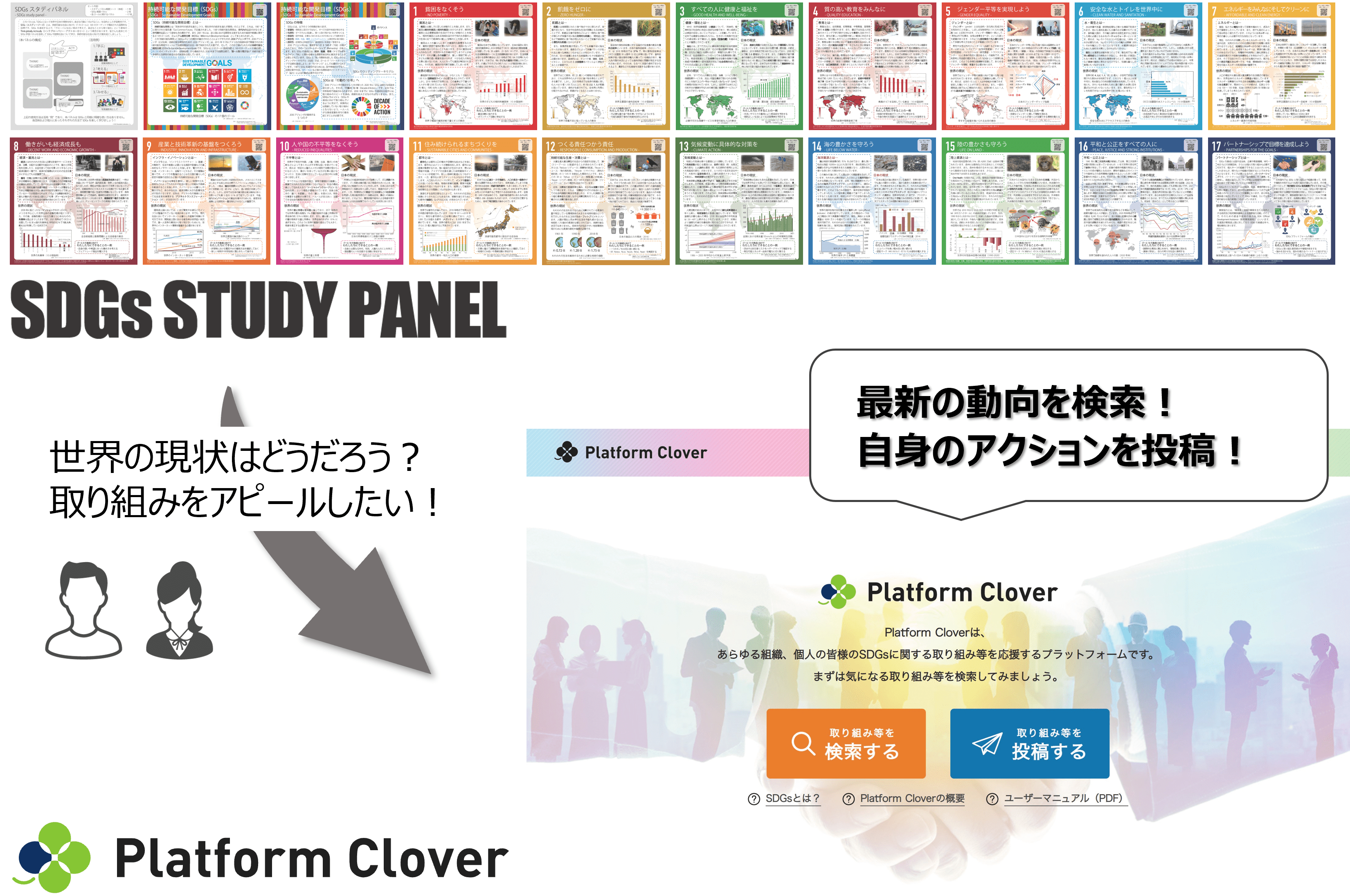 SDGsに関する最新の情報を取集、発信できるよう、オンラインSDGsプラットフォーム(Platform Clover)との連携を意識した枠組みを採用しています。